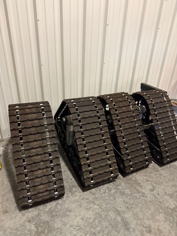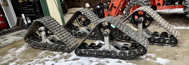Set of 4 (Front and Rear) Dominator XL tracks with HP bogie upgrade 6 x 5.5 bolt pattern with spacers. New in 2017 used twice. Once to test on dirt and the other thru several feet of wet drifted snow to off grid house in Spring 2017. No snow in 2018 so they weren't used at all. This year, neighbor got his D-9 Cat running like a champ and will be plowing the road.