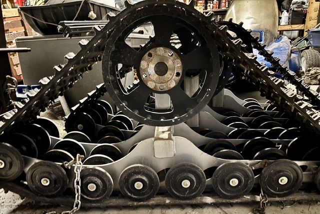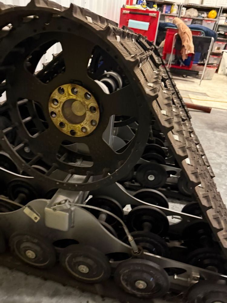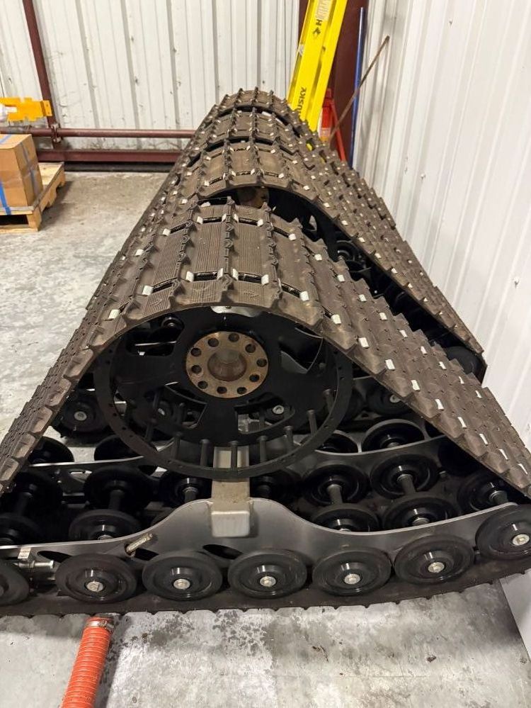 DOMINATOR XL HD Track System suitable for 3/4 ton or 1 ton, gas engine vehicles, and diesels on the lighter side. Has the 8 x 6.5” and 8 x 170mm bolt patterns. Adapters available to the 8 x 180mm or even 6 x 5.5” patterns. This system was built in 2017. The system has been operated by Mount Washington Auto Road, a professional organization with a strict maintenance schedule. This system is simply being rotated out and replaced with a new system. It is in excellent condition and ready for use. Track belts show some wear but are totally usable as is. They are the Hacksaw track belts. Also includes external drive sprockets, a $1,000 upgrade.
