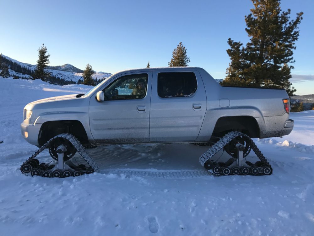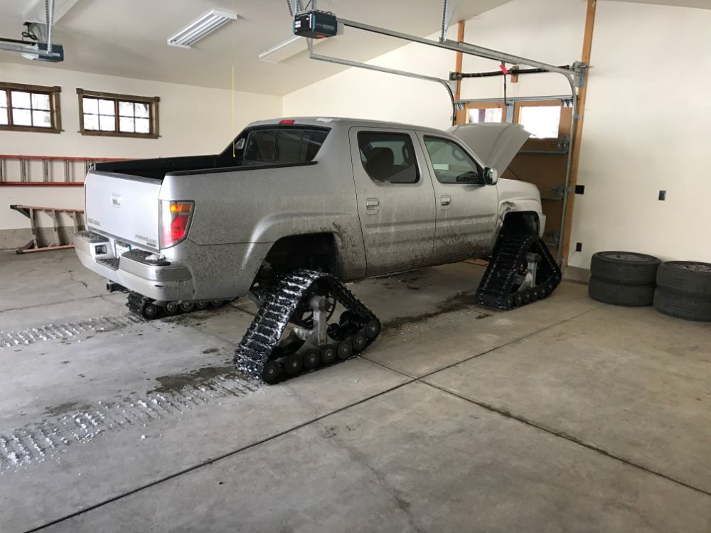 The Honda Ridgeline has a modified suspension with 2” lift kit so the tracks clear the wheel wheels, and brackets installed for the over rotation cables.
